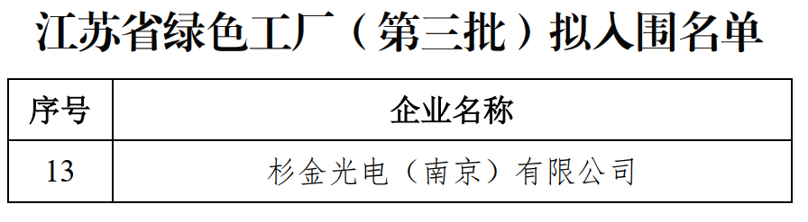 近日,根據江蘇省工信廳《關于開展第三批省級綠色工廠推薦工作的通知》(蘇工信節能[2022]398號)文件要求,經企業自評、地方初審推薦、形式審查、專家評審、專題會審等程序,杉金光電成功入圍2022年江蘇省綠色工廠。
