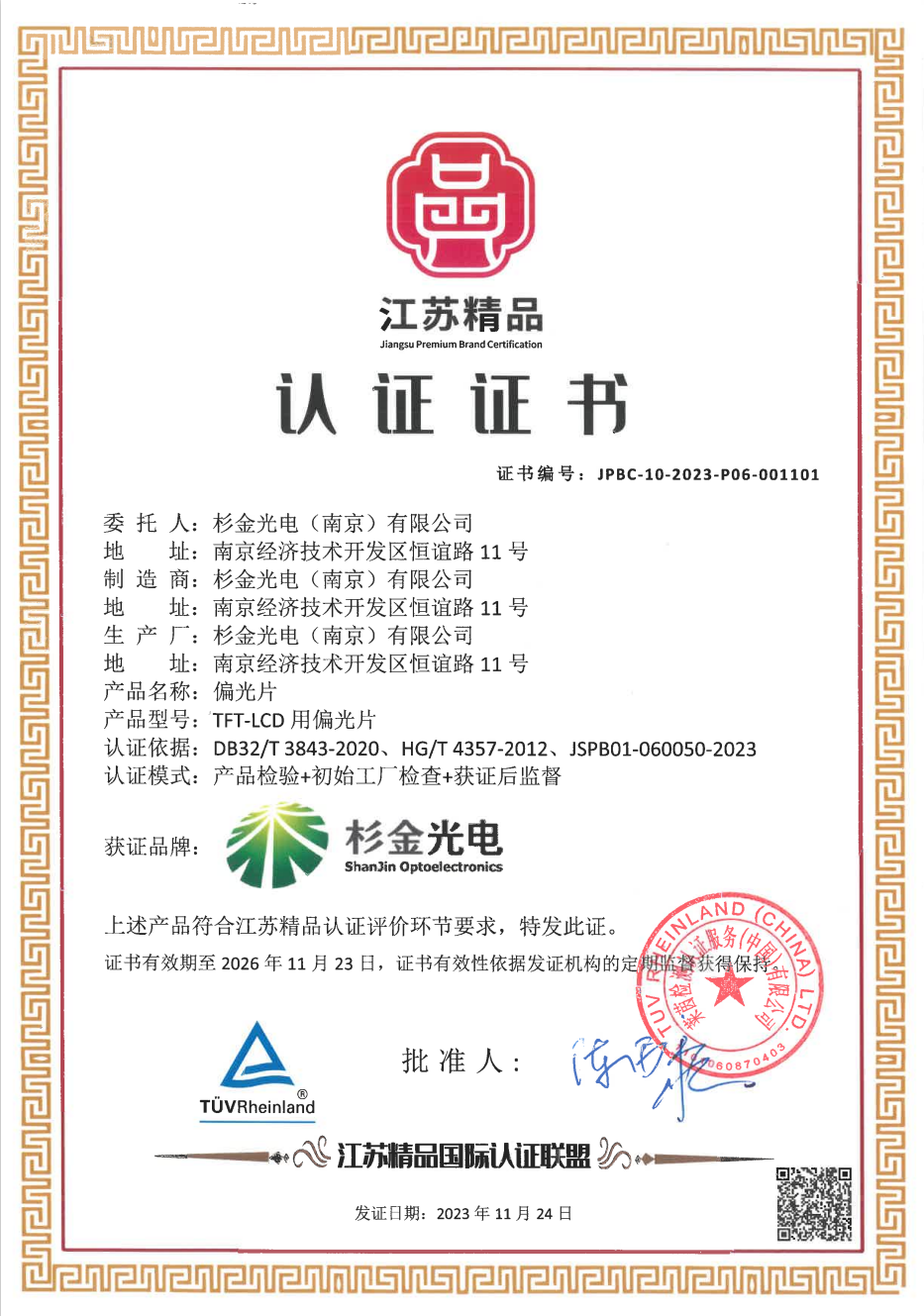 近日,杉金光電成功榮獲“江蘇精品”認證,這是對公司在偏光片領(lǐng)域卓越品質(zhì)和持續(xù)創(chuàng)新的充分肯定。