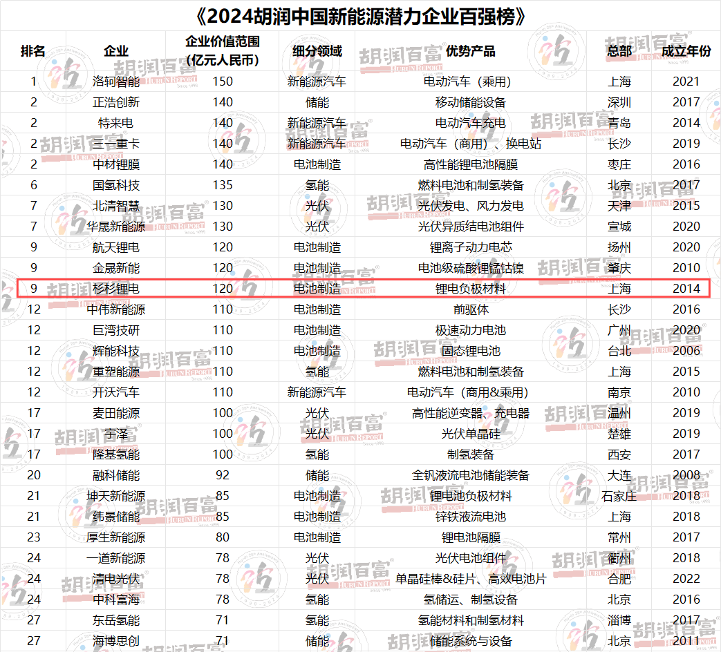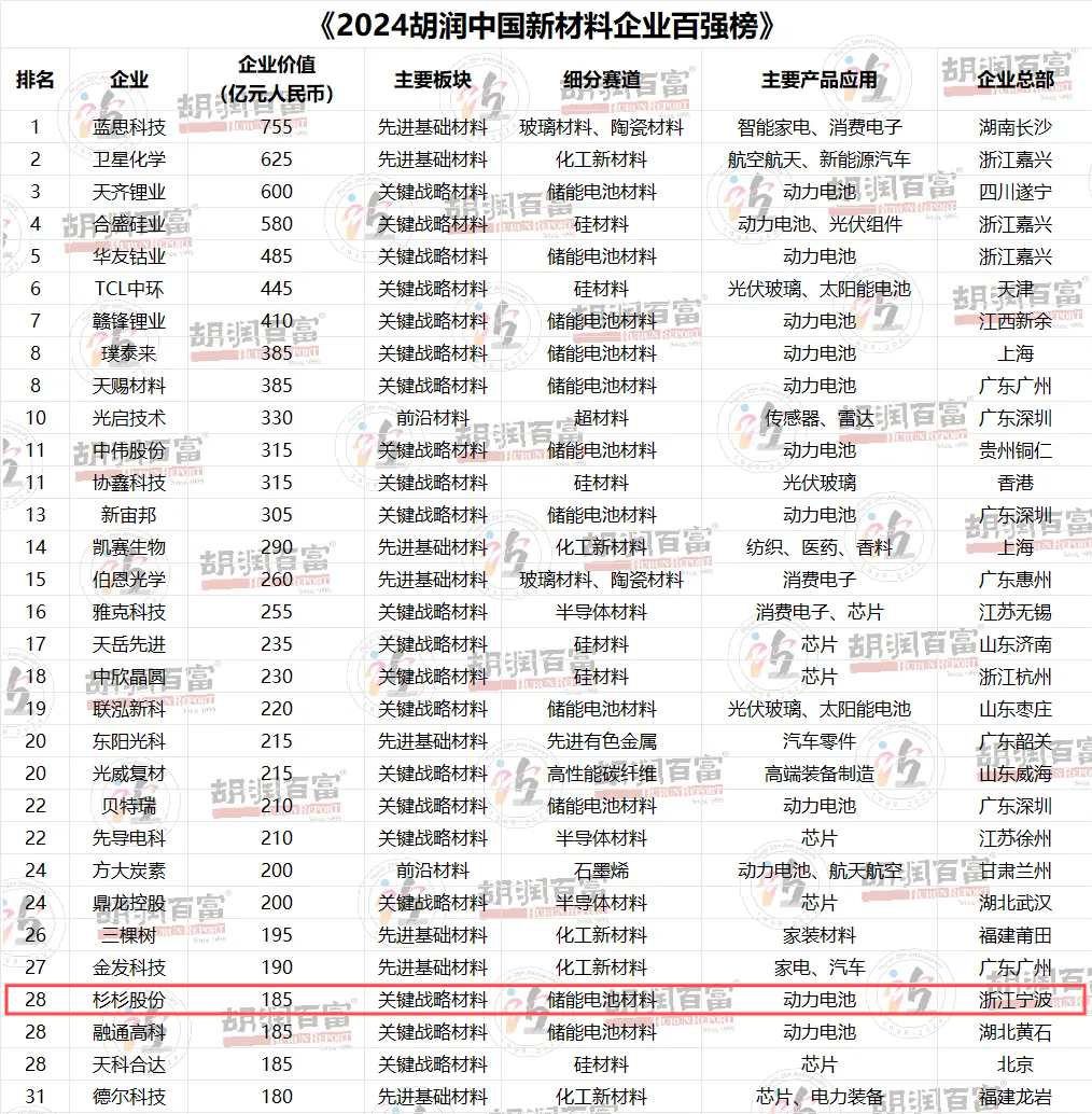 7月26日,胡潤研究院發布《2024胡潤中國新材料企業百強榜》及《2024胡潤中國新能源潛力企業百強榜》。杉杉股份以第28位登上《2024胡潤中國新材料企業百強榜》,杉杉鋰電以第9位登上《2024胡潤中國新能源潛力企業百強榜》。